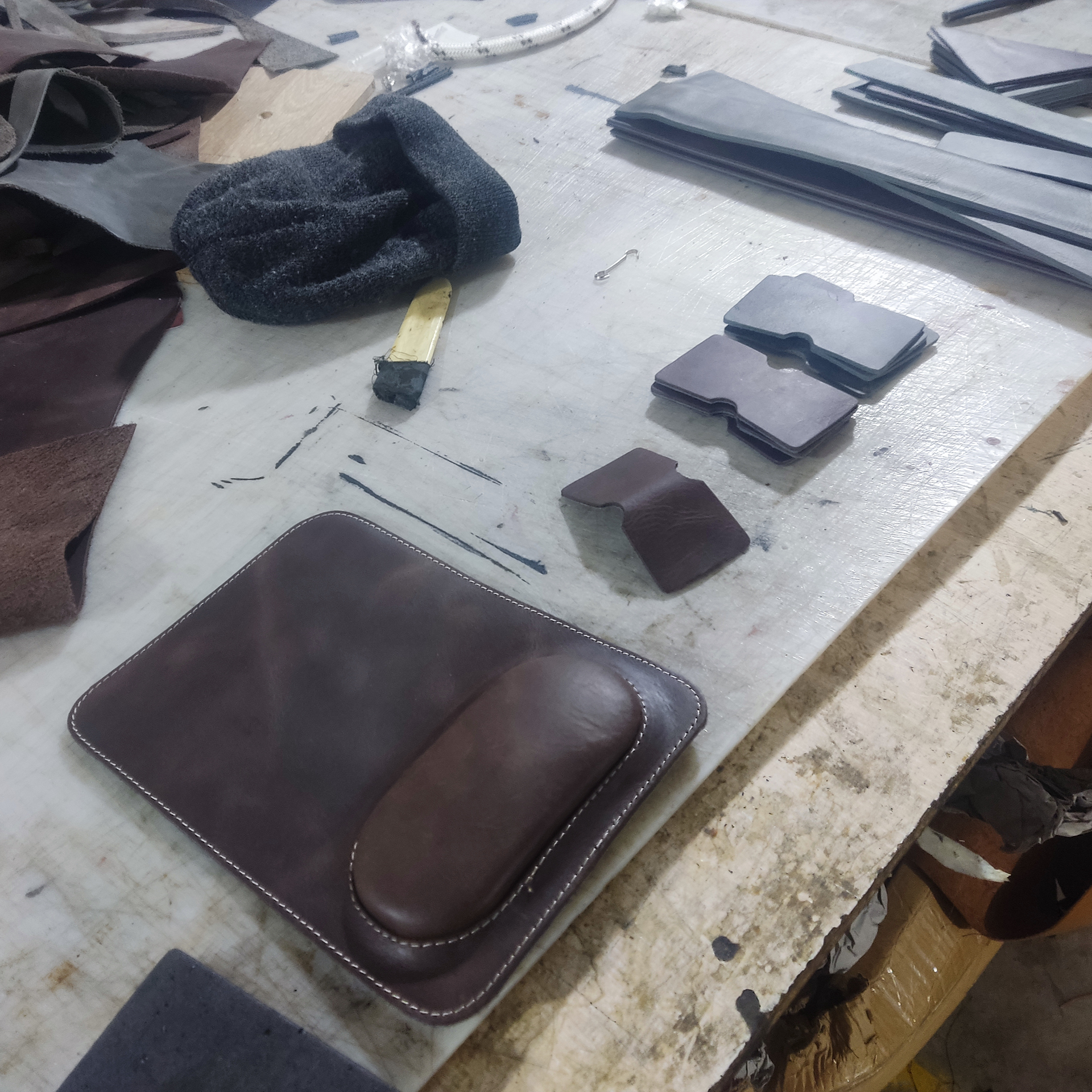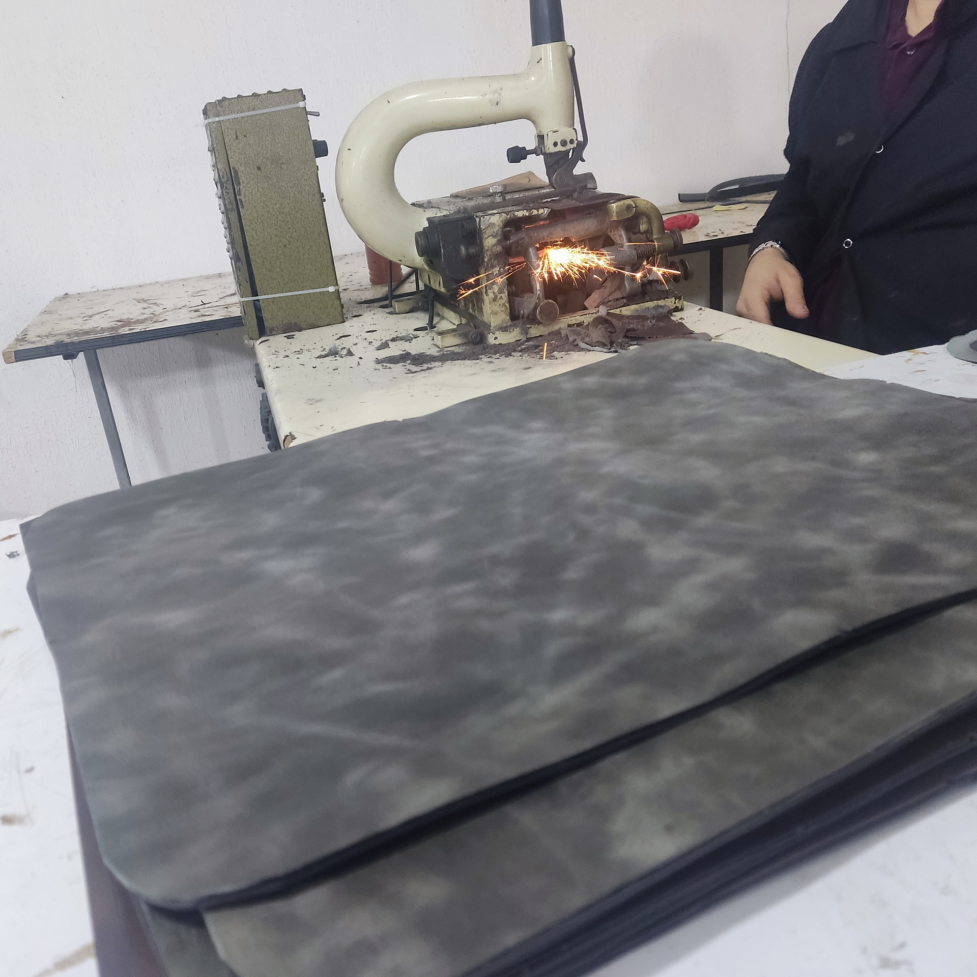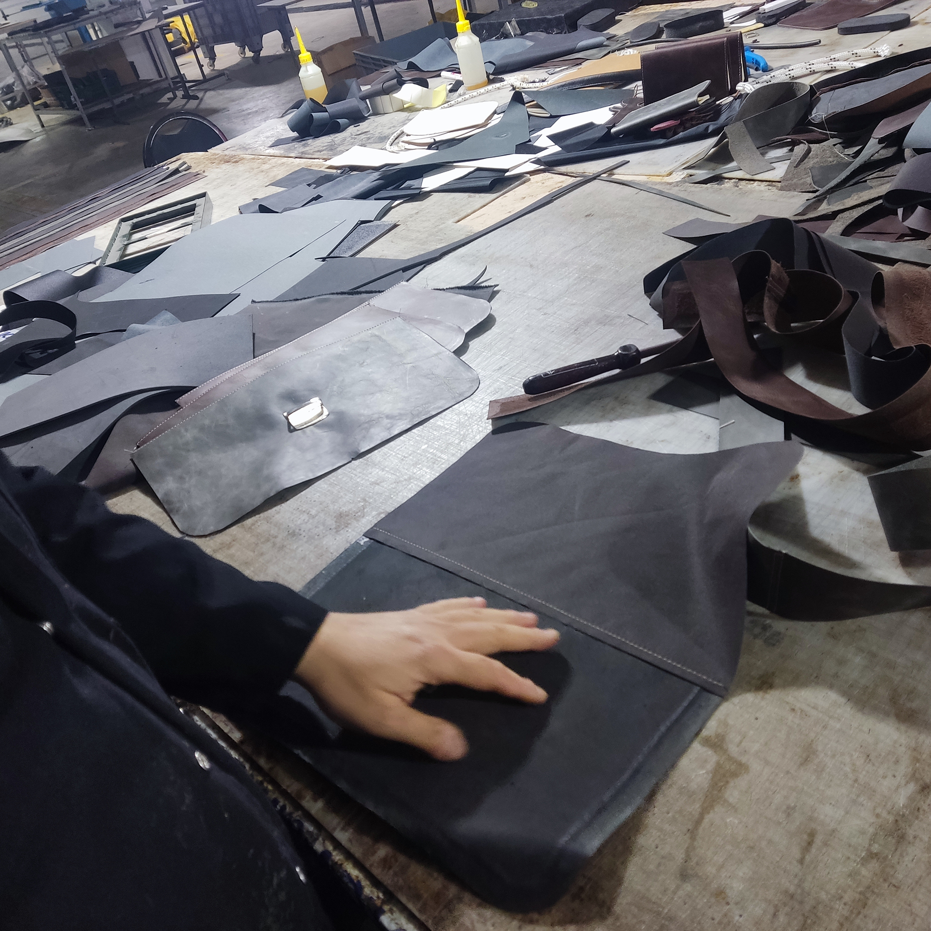Internal layers (RFID lining, padding, fabric linings) are sandwiched between leather and fabric with meticulous care.