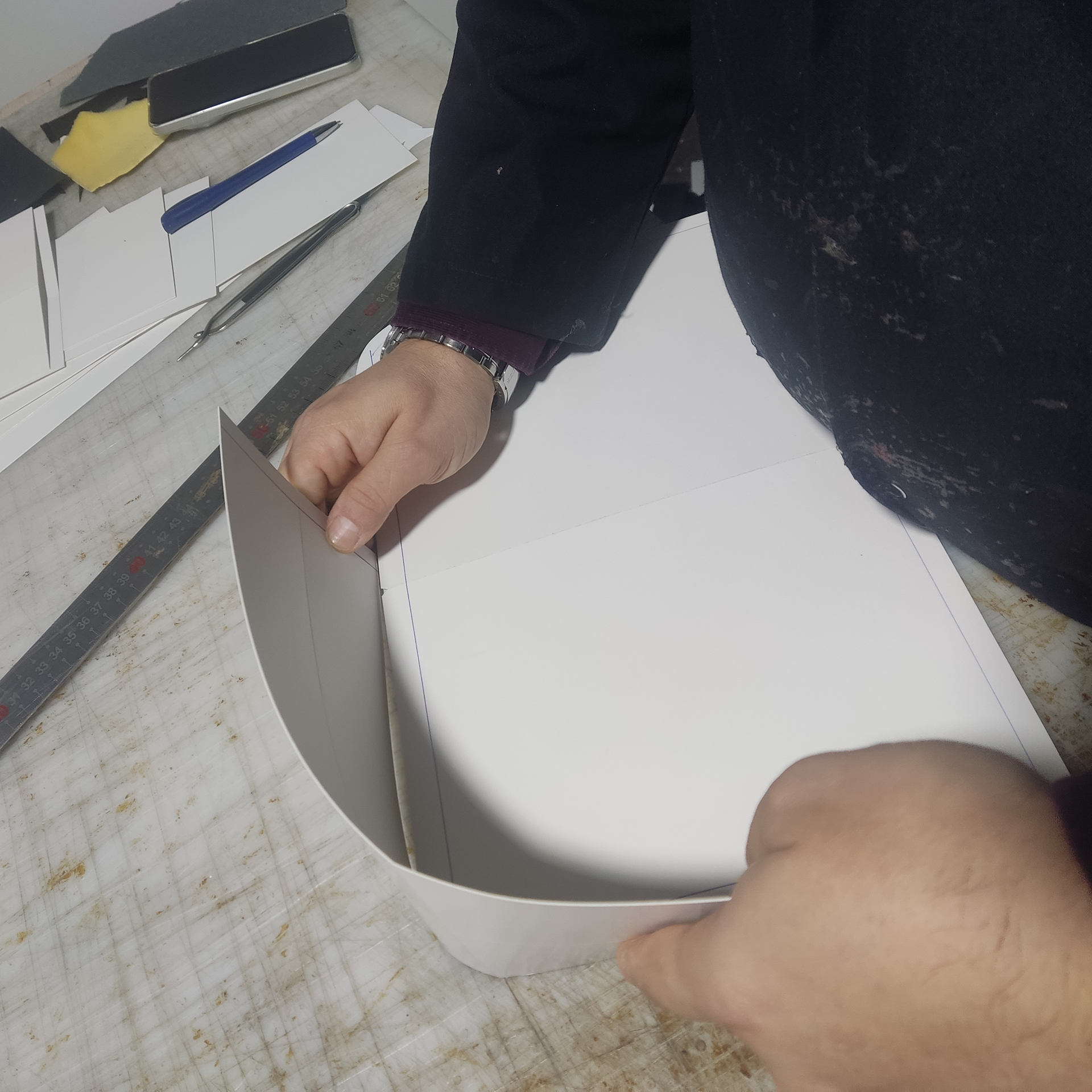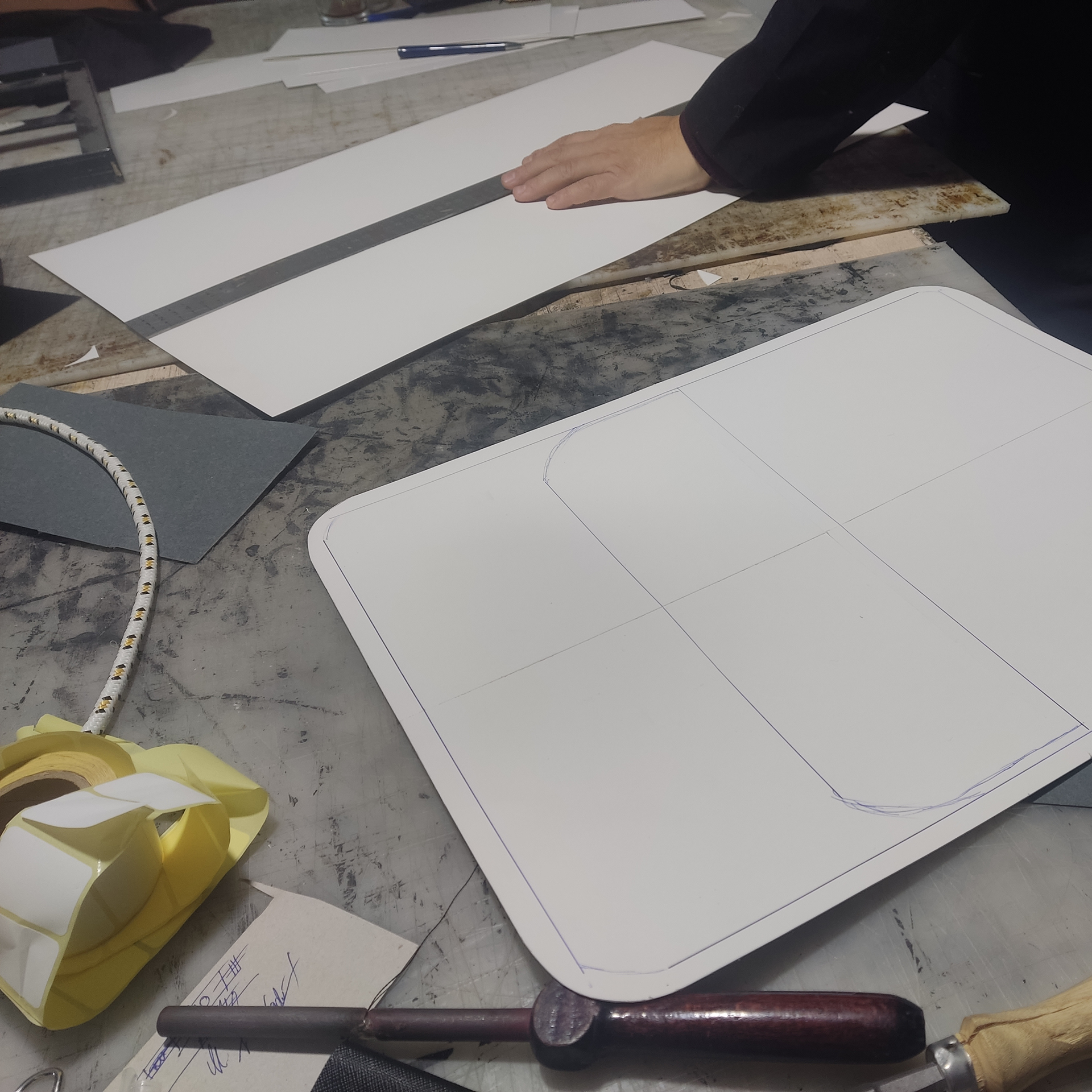Grid-lined drawings and cardboard models for the mouse pad, notebook, and accessory layout.